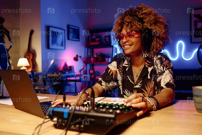 Счастливая молодая ведущая или радиоведущий готовится к трансляции
