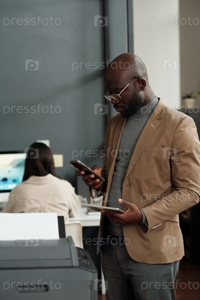 Молодой афроамериканский бизнесмен использует смартфон и планшет