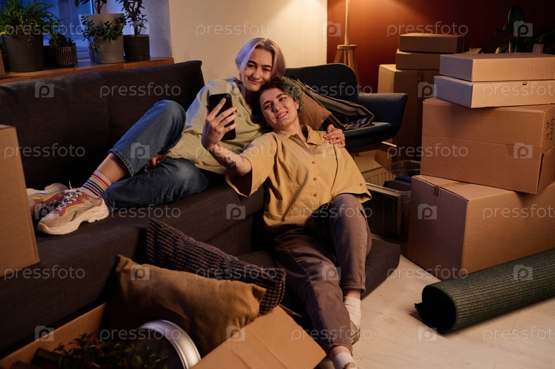Друзья отдыхают на диване в новой квартире