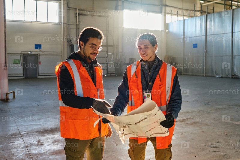 Молодой мультиэтнический инженер указывает на строительный план по чертежу