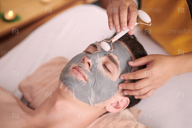 Молодой расслабленный мужчина с закрытыми глазами получает массаж лица на нефритовом ролике
