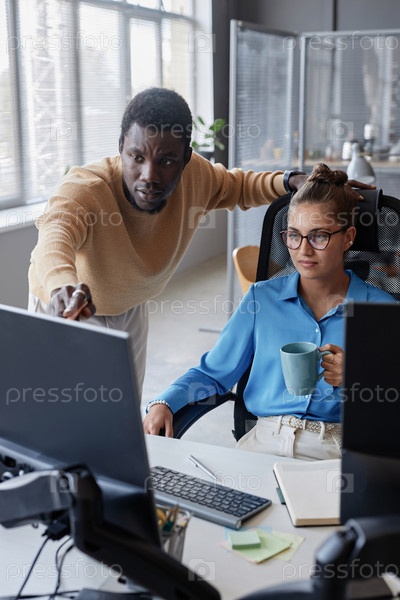 Коллеги обсуждают презентацию на компьютере в команде