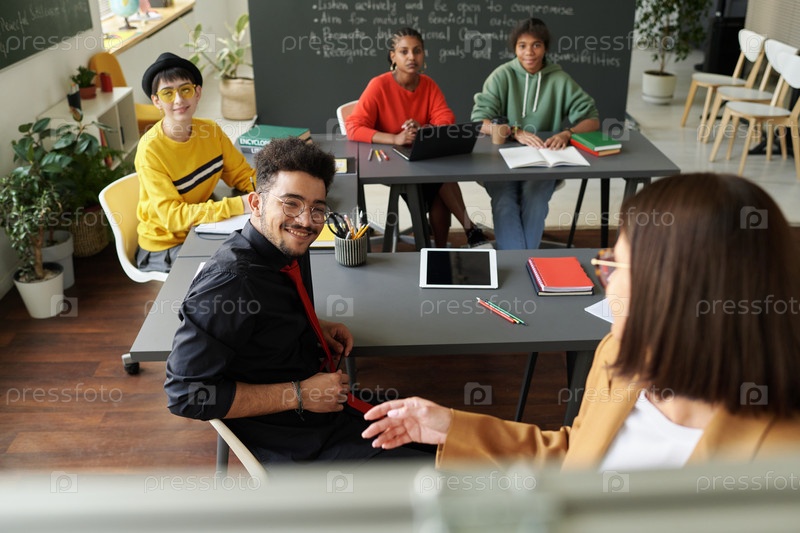 Учитель разговаривает со студентами на уроке