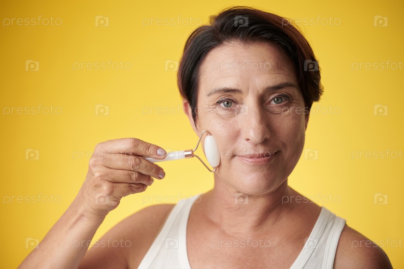 Зрелая женщина массажирует лицо