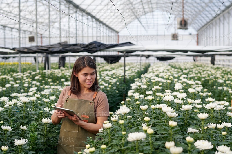 Молодая улыбающаяся женщина в фартуке использует планшет и смотрит на белые цветы