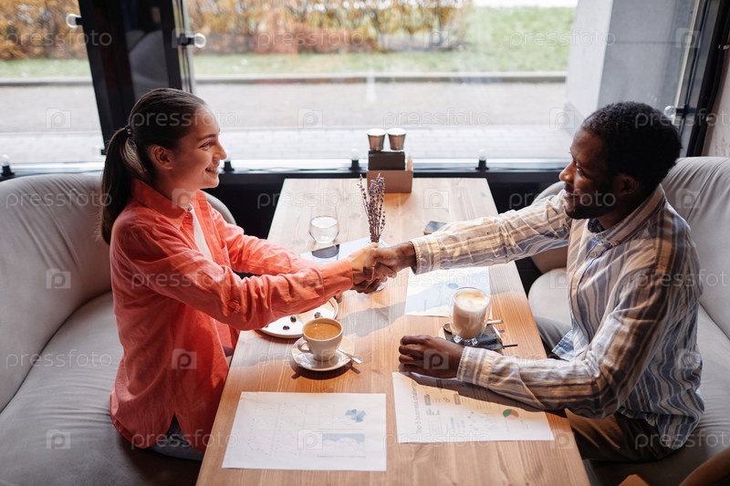 Боковой вид двух молодых коллег, приветствующих друг друга рукопожатием