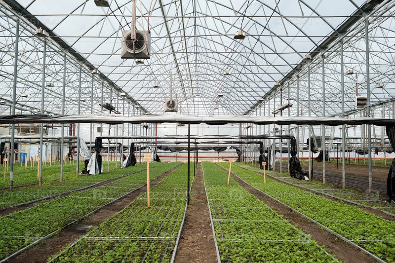Часть просторной промышленной теплицы с длинными рядами зеленых саженцев