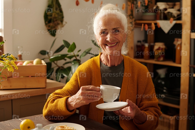 Счастливая старшая женщина с белыми волосами, держащая чашку травяного чая и тарелку