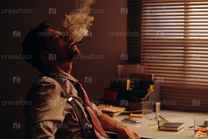 Молодой расслабленный мужчина с сигаретой во рту, дующий дым