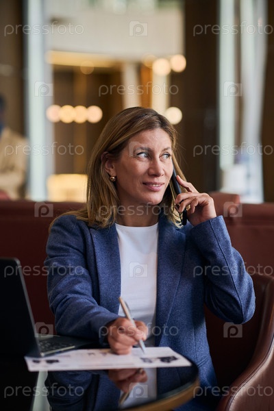 Деловая женщина, работающая в фойе отеля