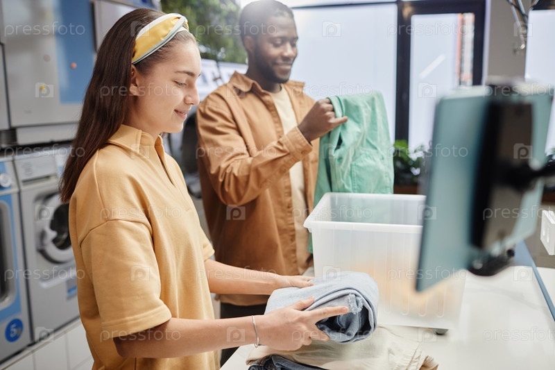 Боковой вид юной улыбающейся женщины, складывающей чистую сухую одежду на столе