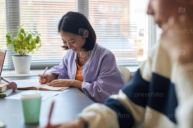 Счастливая молодая азиатская брюнетка просматривает вопросы тестов на бумаге
