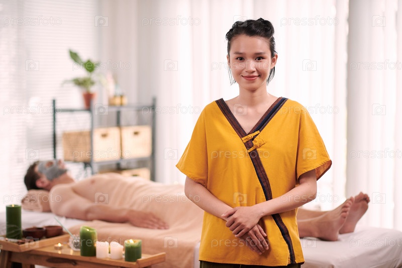 Красивая азиатская девушка в желтой форме стоит перед камерой против клиента