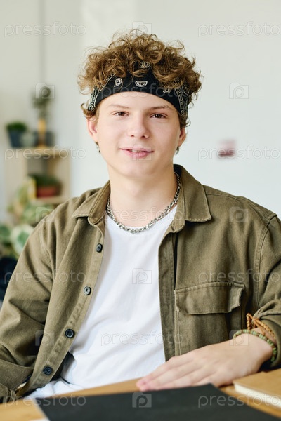 Улыбающийся красивый парень в повседневной одежде сидит за столом перед камерой
