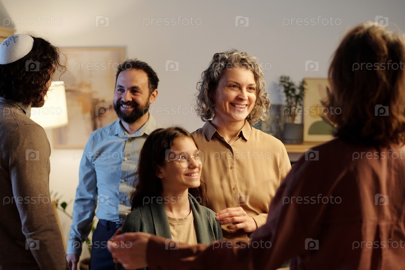 Счастливая зрелая женщина и ее маленькая дочь встречают гостей