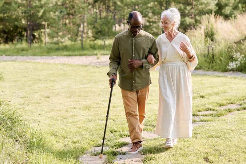 Мультиэтническая старшая пара, гуляющая на свежем воздухе