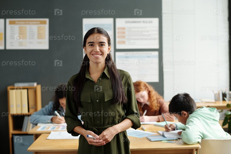 Молодой профессиональный учитель английского языка смотрит на камеру