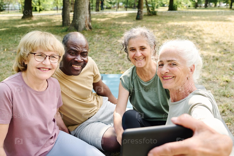 Пожилые люди делают селфи-портрет в парке