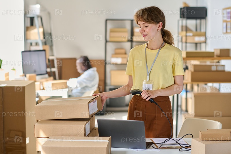 Улыбающаяся молодая женщина в повседневной одежде сканирует QR-коды на упакованных коробках