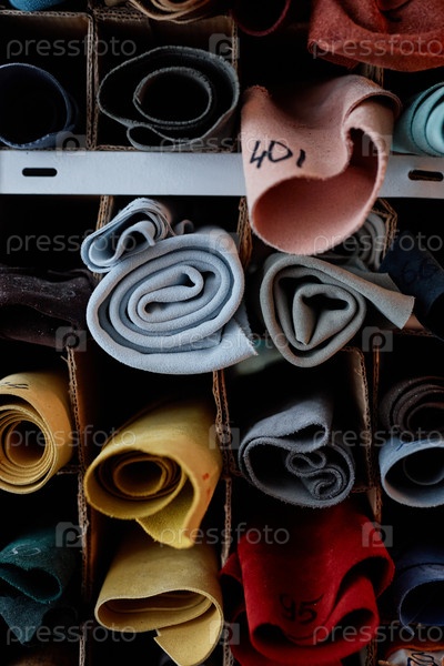Часть стойки полок с разнообразными прокатами из дома и кожи