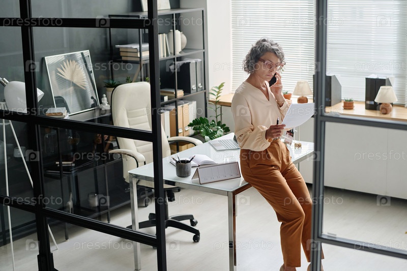 Опытный женский брокер в тихом роскошном наряде читает текст контракта