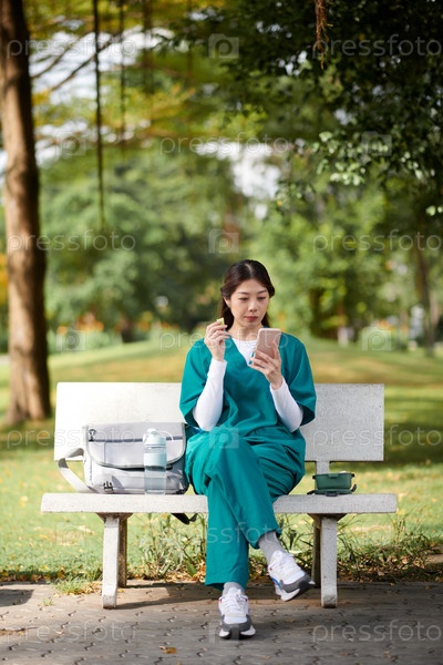 Медсестра прокручивает социальные сети и ест закуски