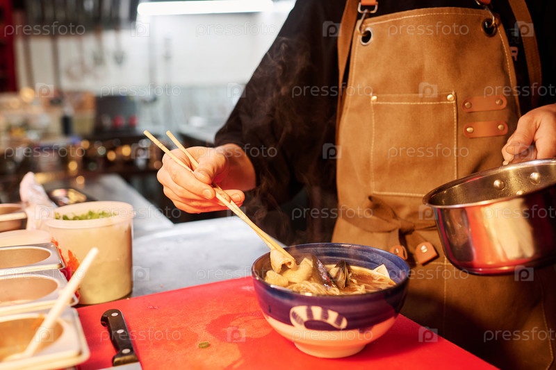 Близкий план молодого повара в фартуке, который кладет мидии и другие морепродукты в тарелку
