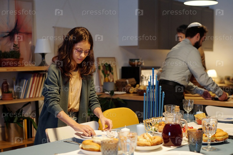 Молодая девушка в повседневной одежде и очках кладет серебряную посуду на тарелку