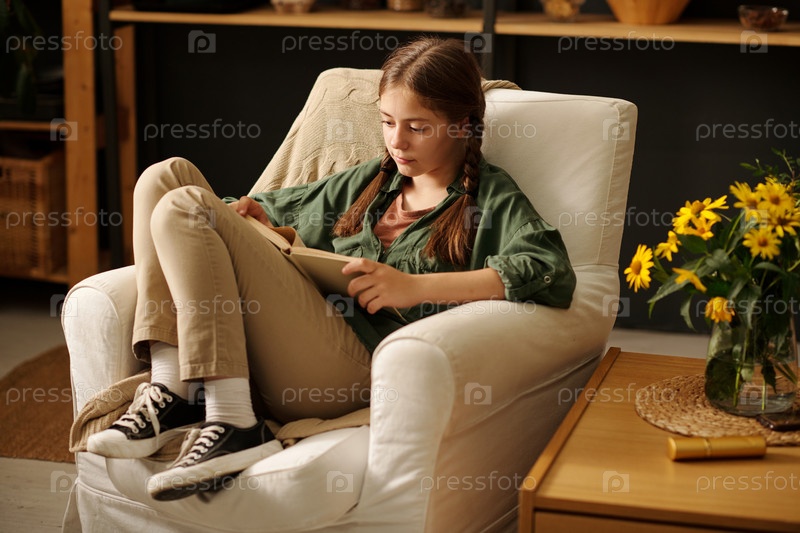 Милая серьезная школьница в повседневной одежде смотрит через текст на страницах открытой книги