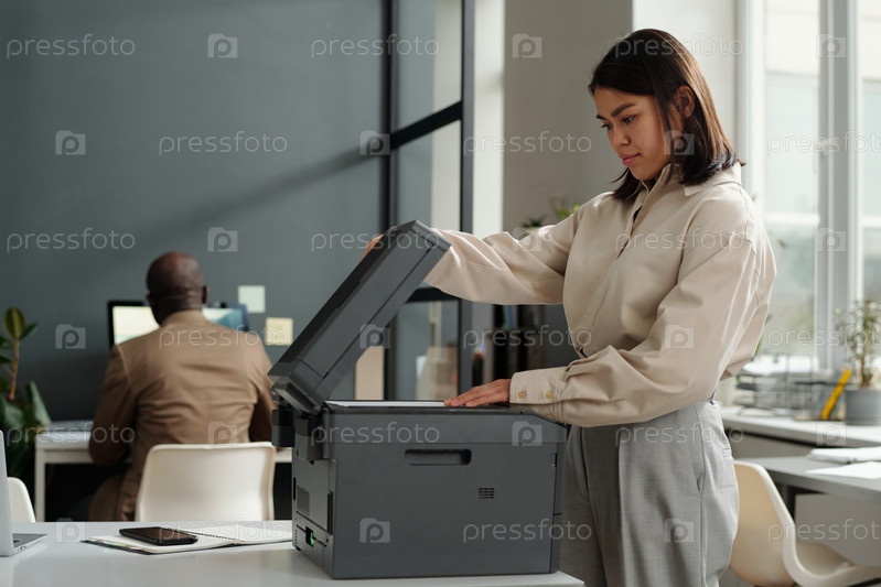 Молодая секретарша или офисная работница кладет бумагу на сканирующее стекло