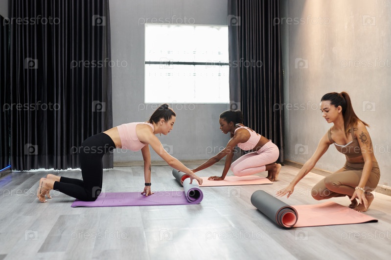 Rolling out Yoga Mats Женщины Прокатывающие йога-матсы