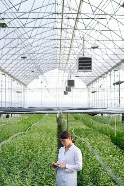 Длинный снимок молодой исследовательницы в лабораторном халате, которая смотрит на экран планшета
