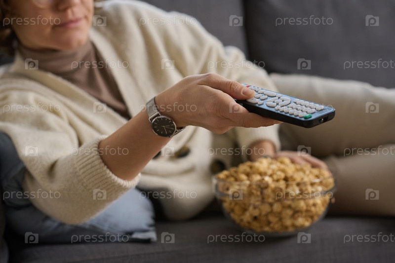 Женщина смотрит телевизор с попкорном