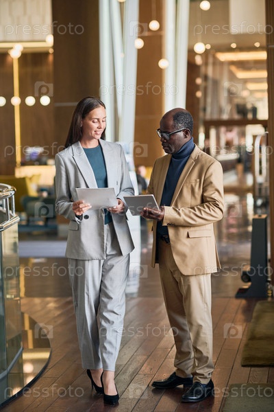 Коллеги обсуждают работу во время встречи в отеле