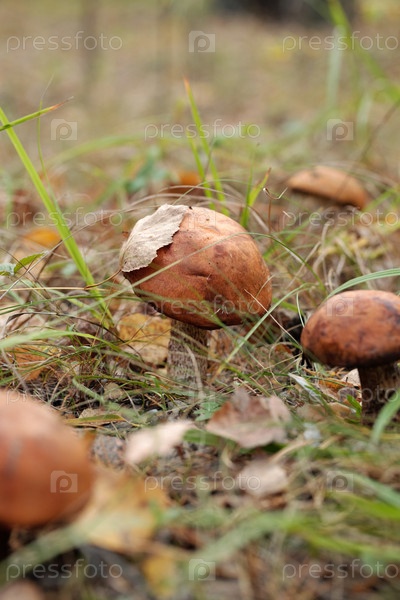 Сосредоточьтесь на boletus mushroom с сухим листом на апельсиновой шапке