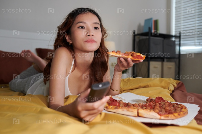 Девушка ест пиццу в постели