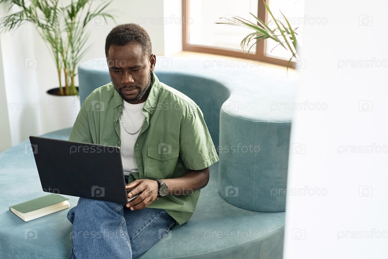 Мужчина, работающий на ноутбуке в коридоре офиса