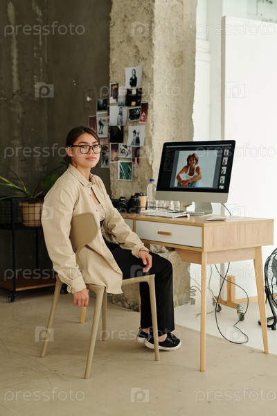 Молодой профессиональный фотограф смотрит на камеру, сидя у рабочего места