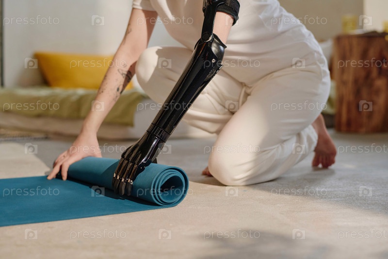 Женщина с протезируемой рукой, прокатывающаяся йога-матку