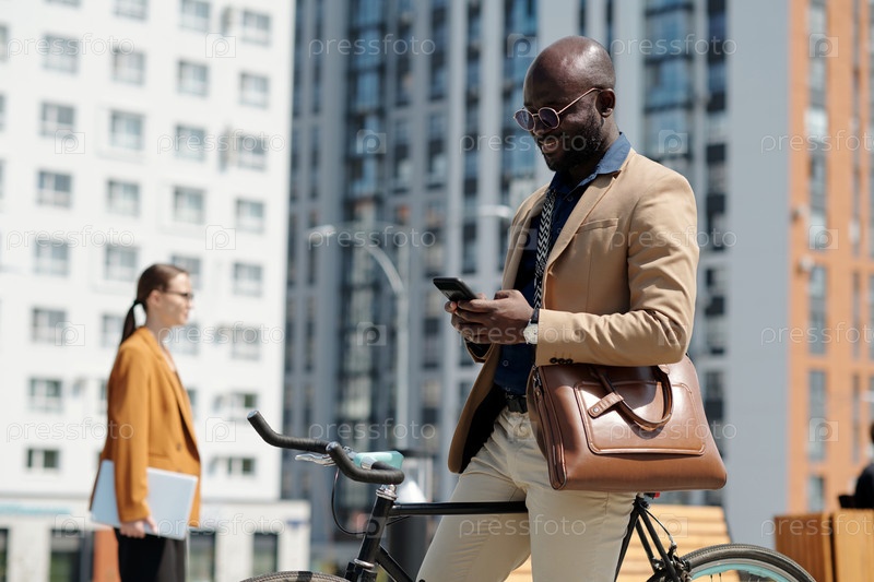 Улыбающийся афроамериканский бизнесмен смотрит на экран смартфона