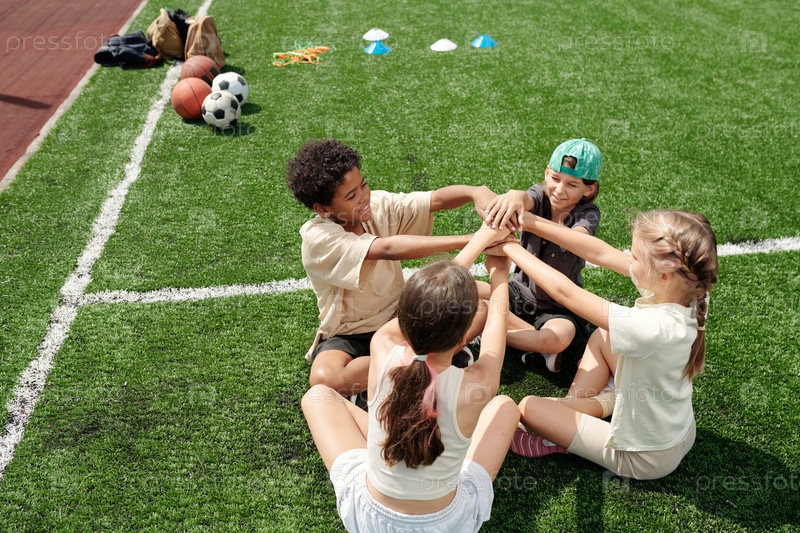 Группа межкультурных детей, поднимающих вытянутые руки и делая кучу рук