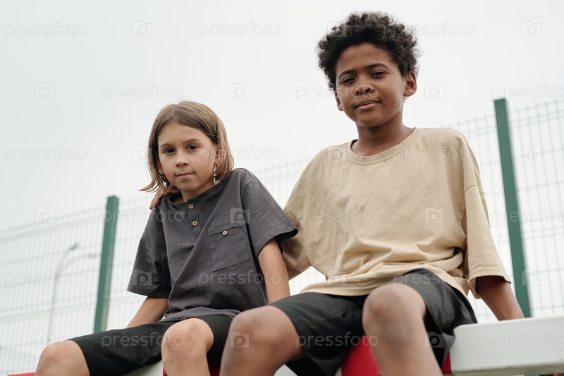 Два школьника в футболках смотрят на камеру, сидя над воротами