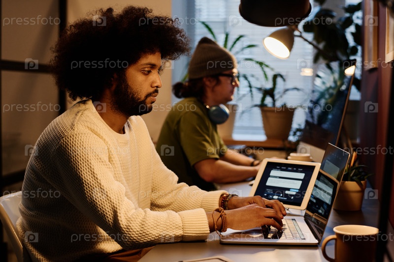 Серьезный парень смотрит на экран ноутбука