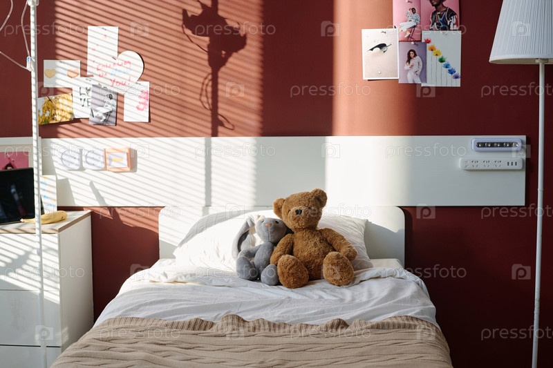 Лучи солнца падают на две милые мягкие игрушки, сидящие на кровати пациента