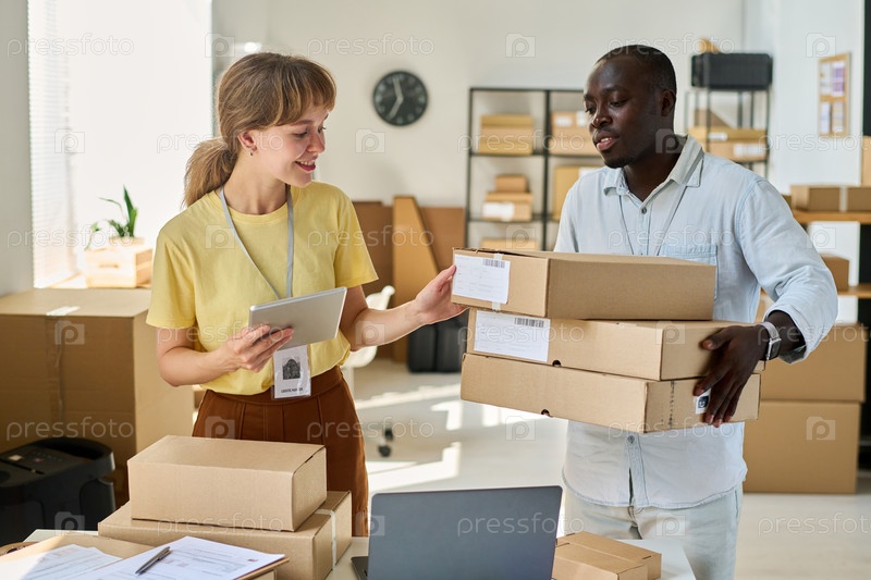 Счастливая молодая женщина с планшетом проверяет личные данные на ящиках