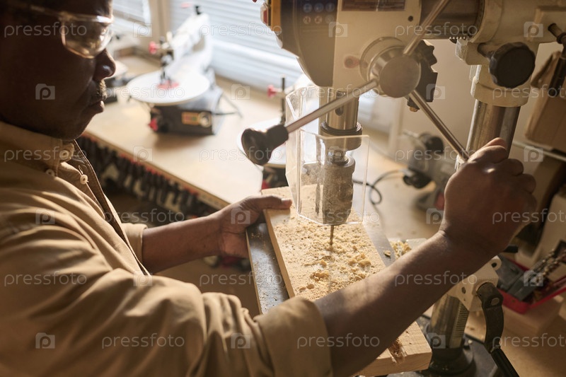 Черный плотник пробуривает деревянную доску с помощью машины
