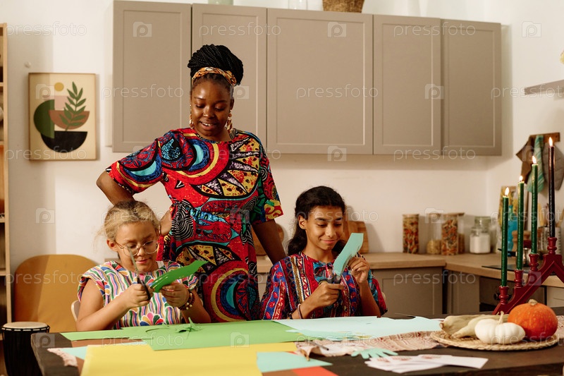 Молодая женщина смотрит на своих дочерей, режущих бумагу во время подготовки поздравительных открыток