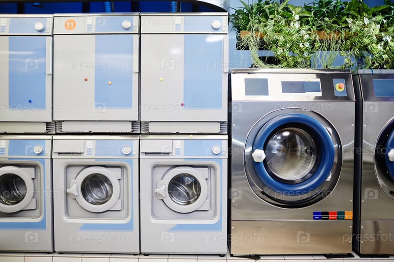 Ряд новых бело-синих стиральных машин стоит рядом с серебряными