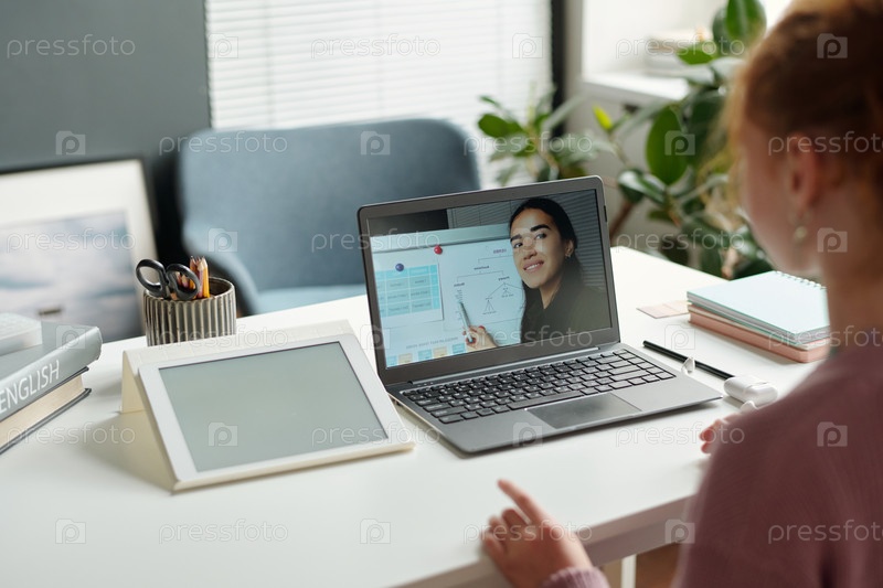 Сосредоточьтесь на экране ноутбука с учителем английского языка, объясняющим новые правила грамматики