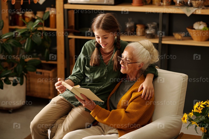 Милая девочка обнимает свою бабушку, сидя рядом с ней в кресле